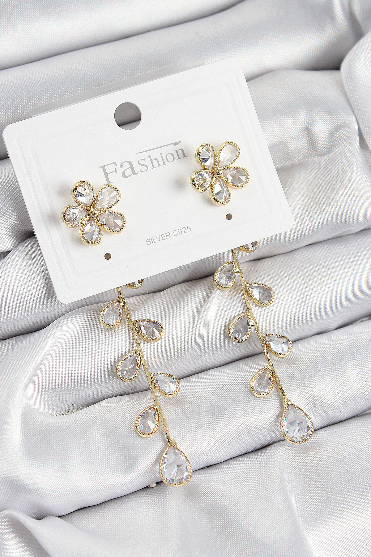 Pirinç Zirkon Taşlı Sallantılı Çiçek Model Gold Renk 925 Ayar Gümüş Çivi Kadın Küpe - TJ-BKP10970