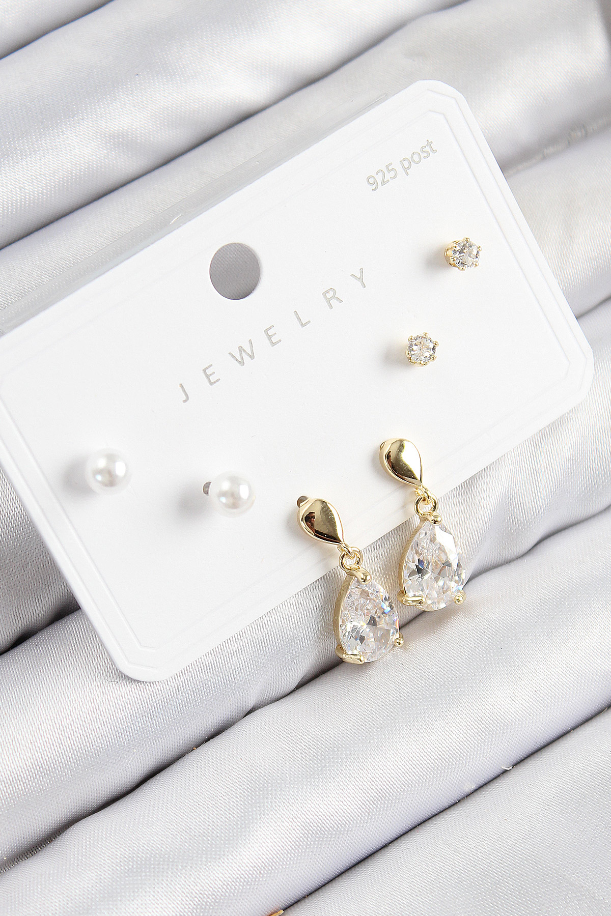 Pirinç Zirkon Taşlı Sallantılı Damla Model Gold Renk 925 Ayar Gümüş Çivi Kadın Küpe Set - TJ-BKP11172