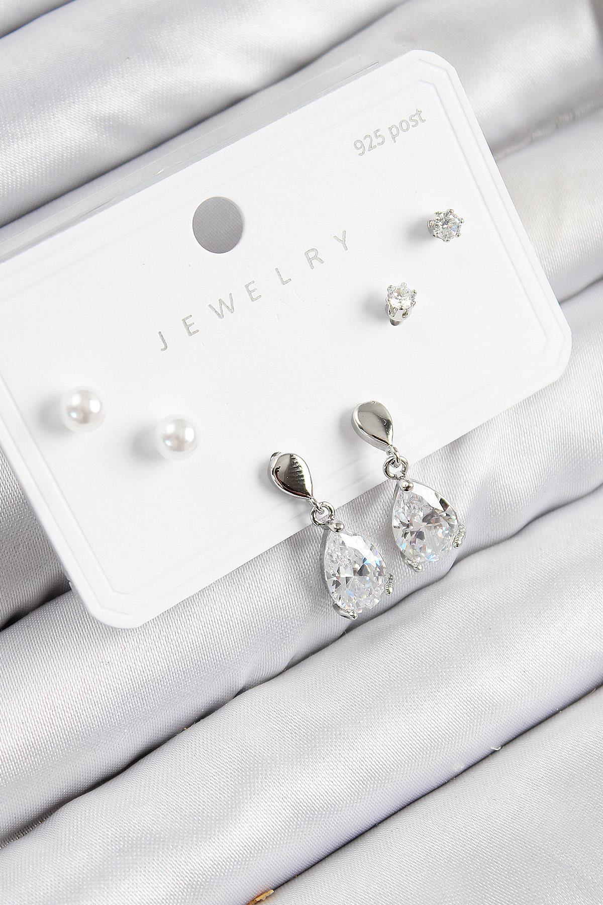 Pirinç Zirkon Taşlı Sallantılı Damla Model Gümüş Renk 925 Ayar Gümüş Çivi Kadın Küpe Set - BKP11171