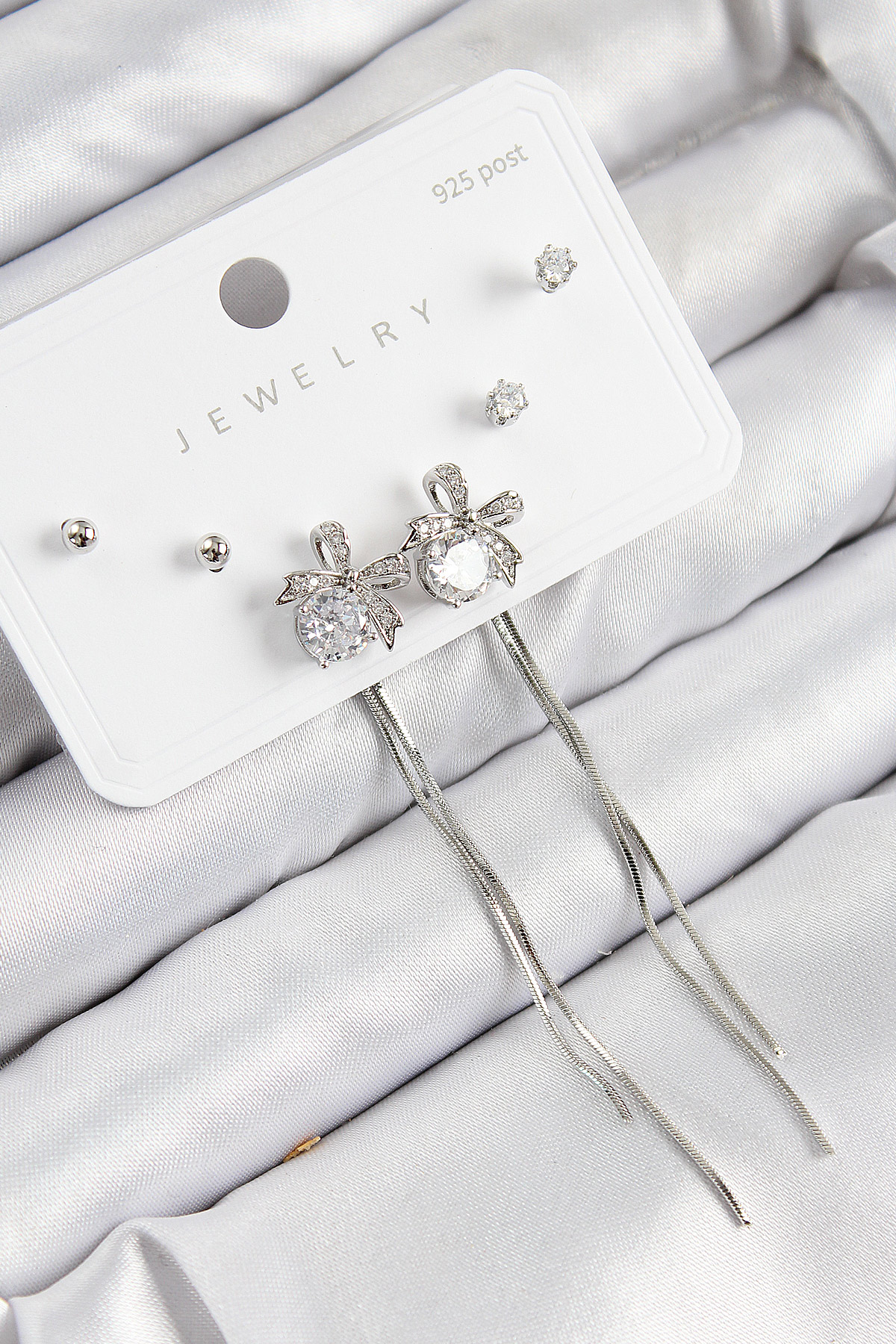 Pirinç Zirkon Taşlı Sallantılı Fiyonk Model Gümüş Renk 925 Ayar Gümüş Çivi Kadın Küpe Set - TJ-BKP11169