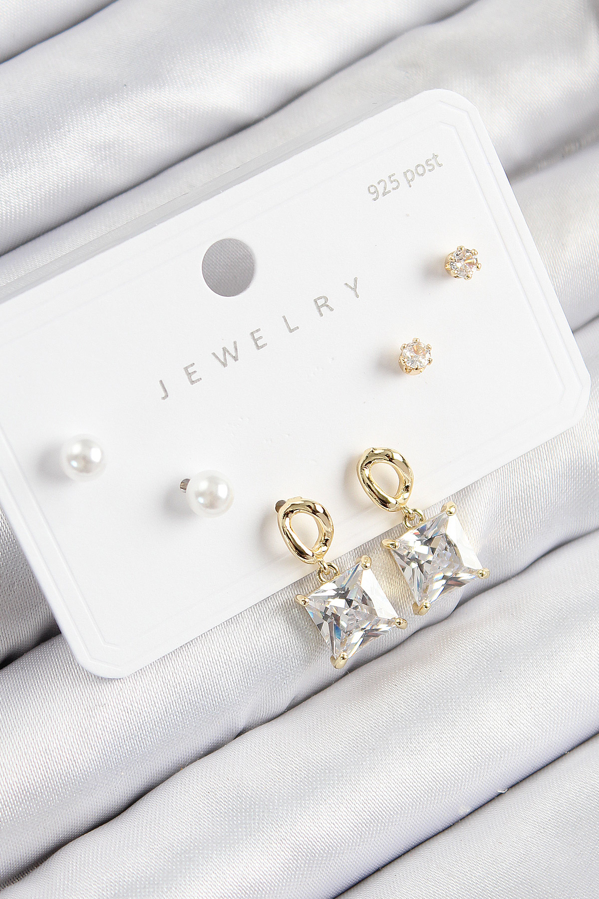 Pirinç Zirkon Taşlı Sallantılı Kare Model Gold Renk 925 Ayar Gümüş Çivi Kadın Küpe Set - TJ-BKP11162