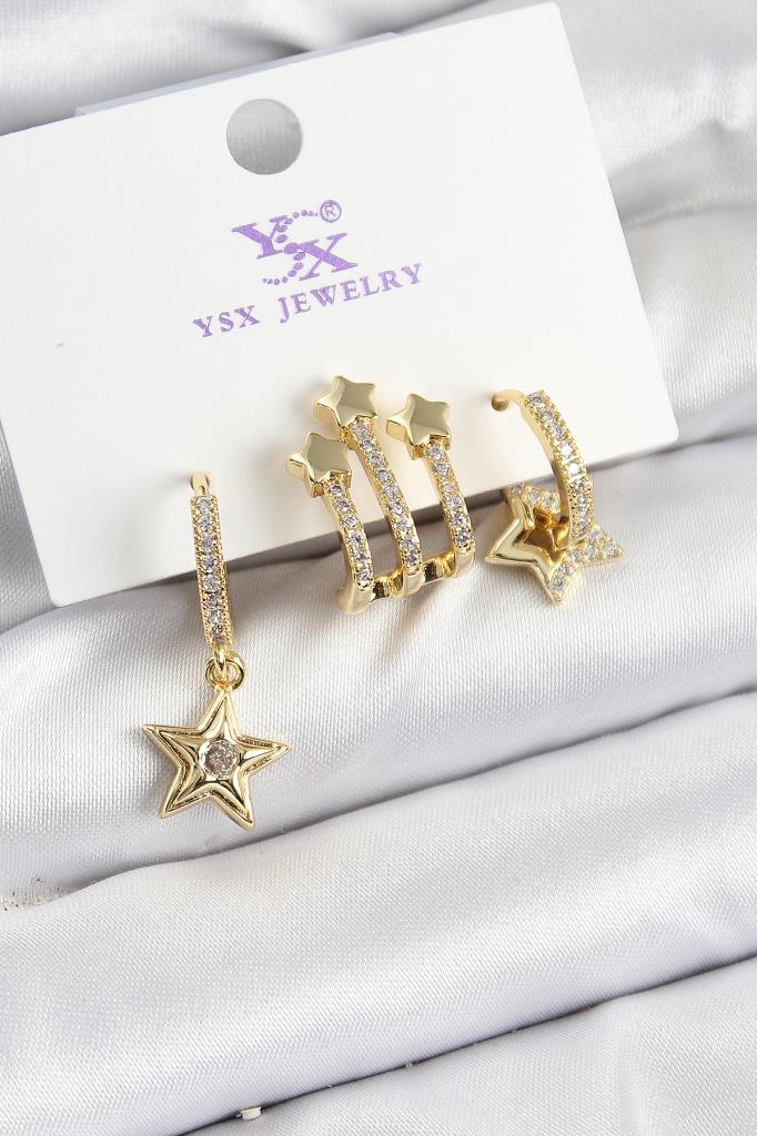 Pirinç Zİrkon Taşlı Sallantılı Yıldız Model Gold Renk 3'lü Kadın Küpe - BKP10940