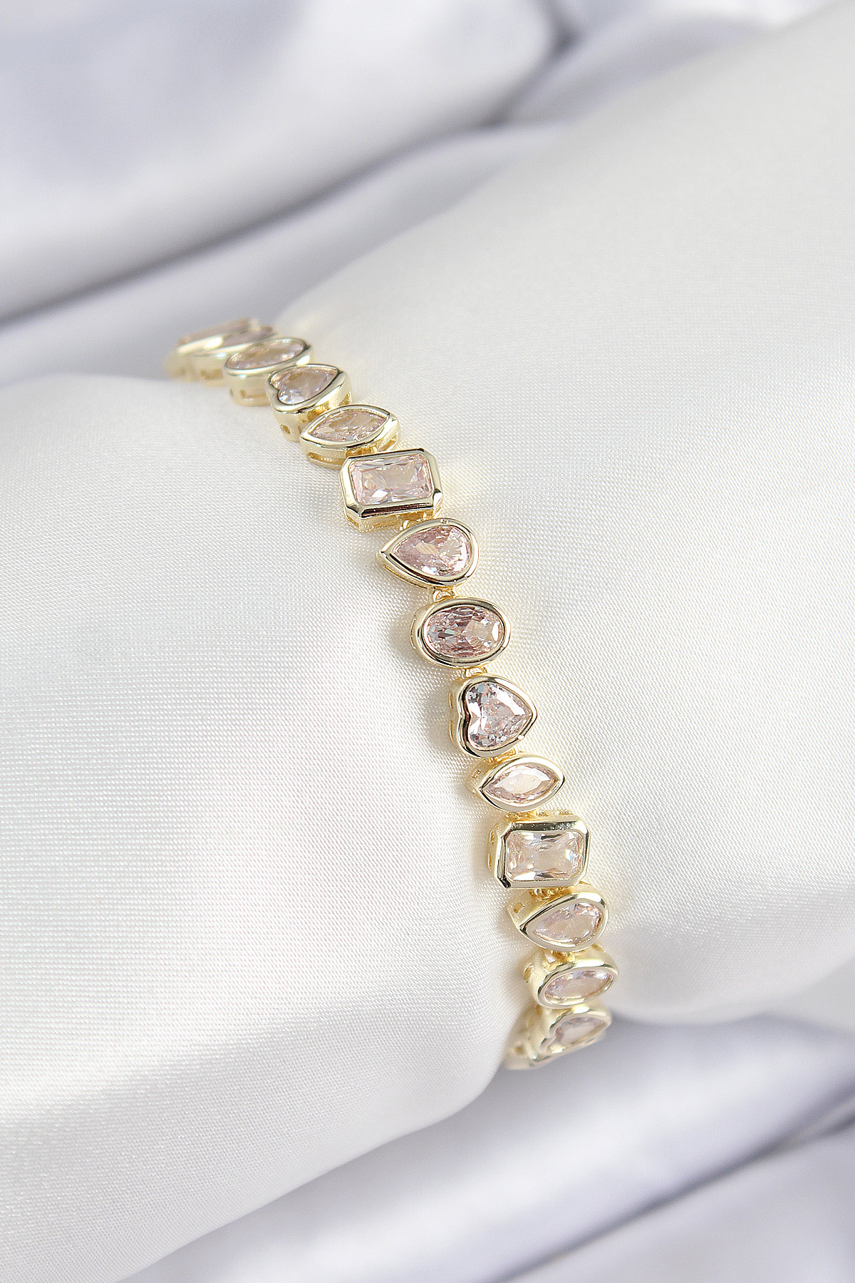 Pirinç Zirkon Taşlı Sıralı Damla Kalp Ve Dikdörtgen Model Gold Renk Kadın Bileklik - TJ-BB7490