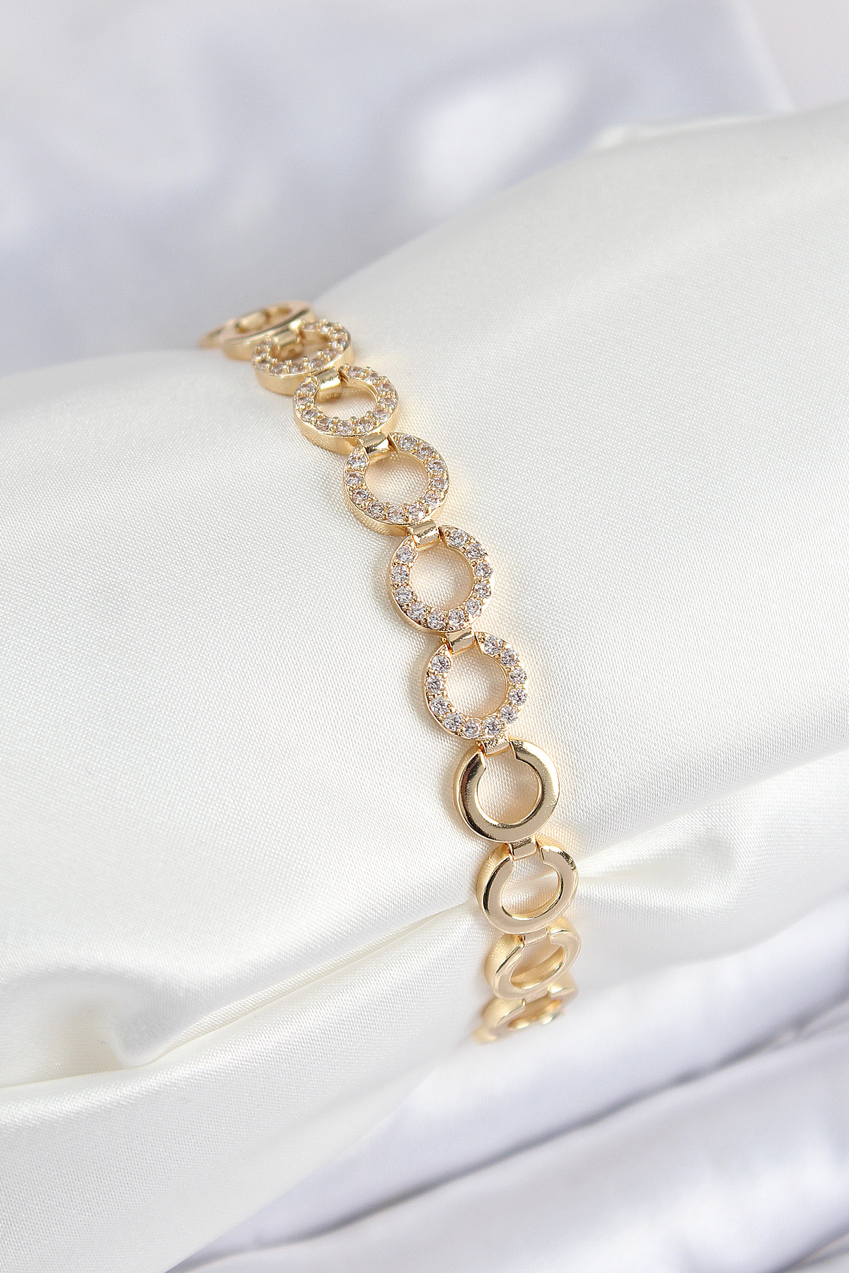 Pirinç Zirkon Taşlı Sıralı Halka Model Gold Renk Kadın Bileklik - TJ-BB7555