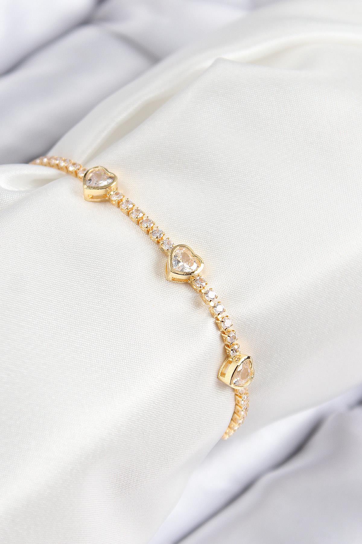 Pirinç Zirkon Taşlı Sıralı Kalp Model Gold Renk Kadın Bileklik - BB7729
