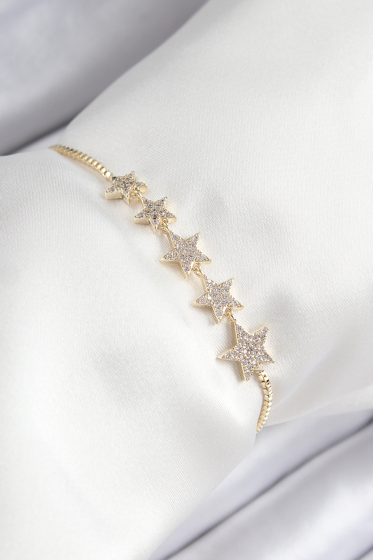 Pirinç Zirkon Taşlı Sıralı Yıldız Model Gold Renk Asansörlü Kadın Bileklik - TJ-BB7460