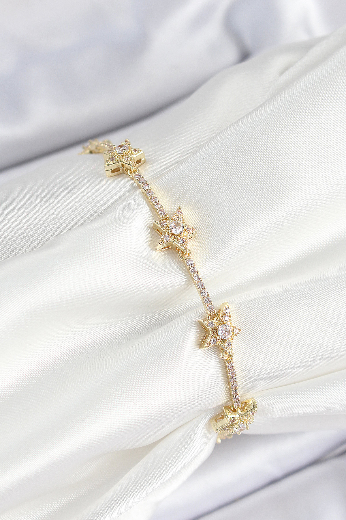 Pirinç Zirkon Taşlı Sıralı Yıldız Model Gold Renk Kadın Bileklik - TJ-BB7487