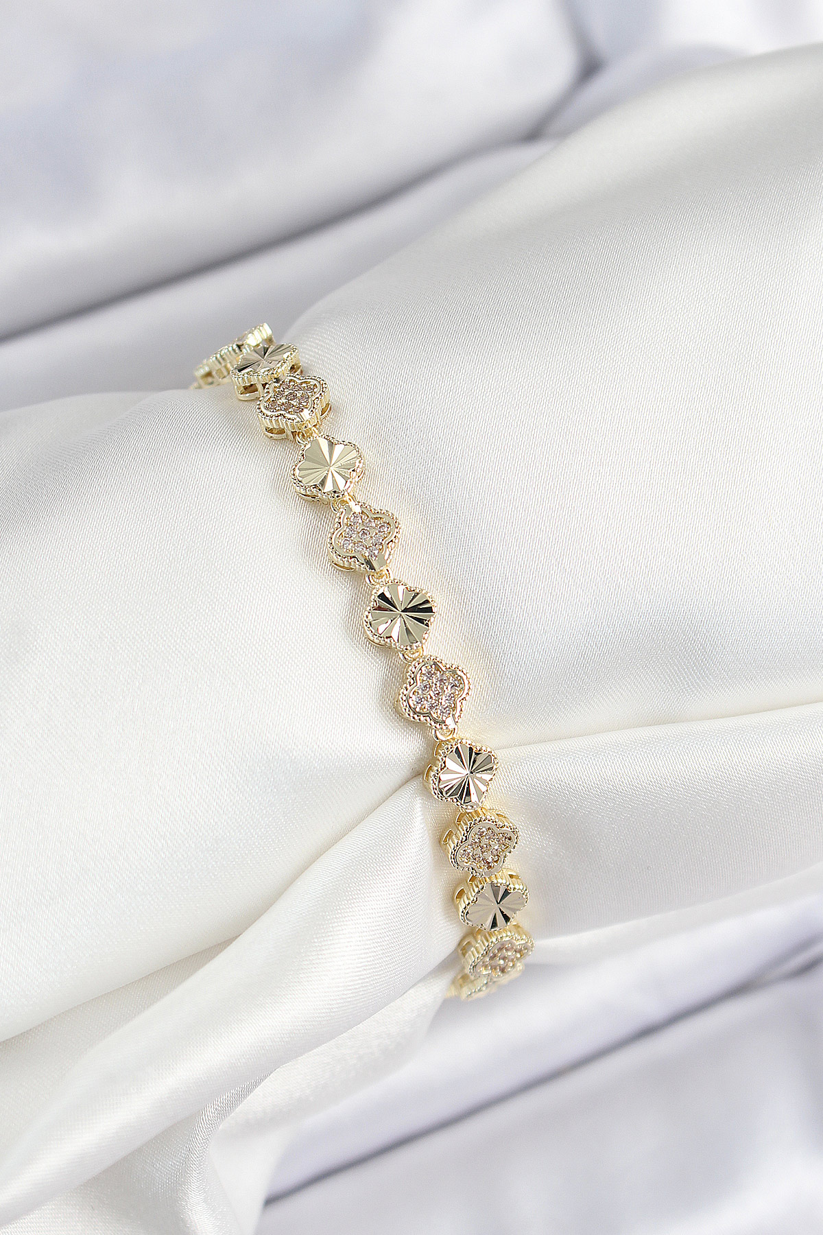Pirinç Zirkon Taşlı Sıralı Yonca Model Gold Renk Kadın Bileklik - TJ-BB7489