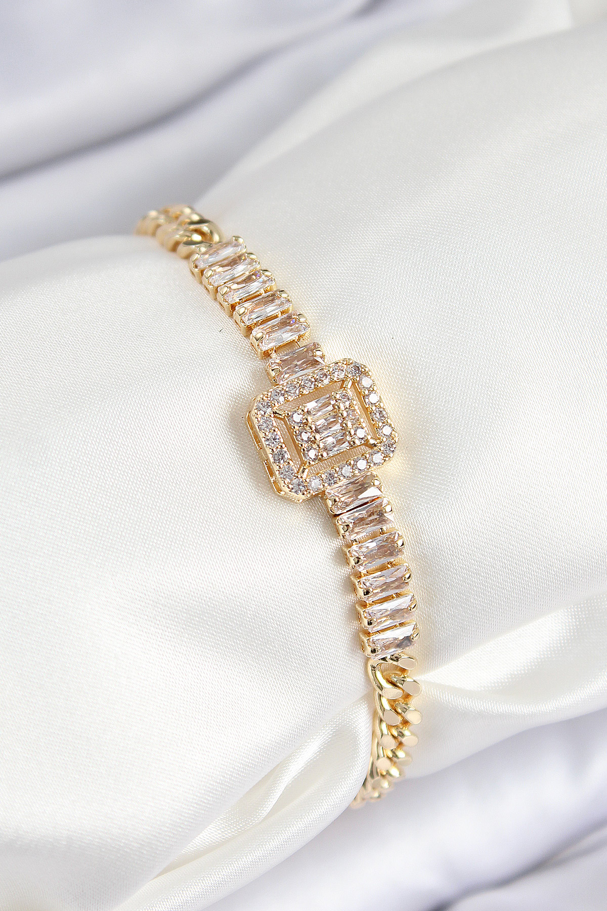 Pirinç Zirkon Taşlı Su Yolu Detaylı Baget Model Gold Renk Kadın Bileklik - TJ-BB7539