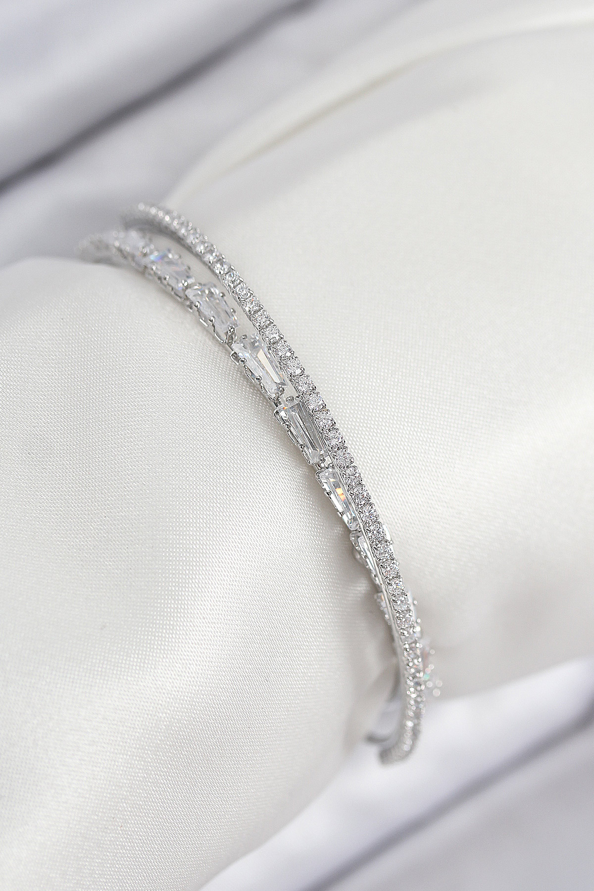Pirinç Zirkon Taşlı Su Yolu Model Gümüş Renk Kadın Bileklik - TJ-BB7882