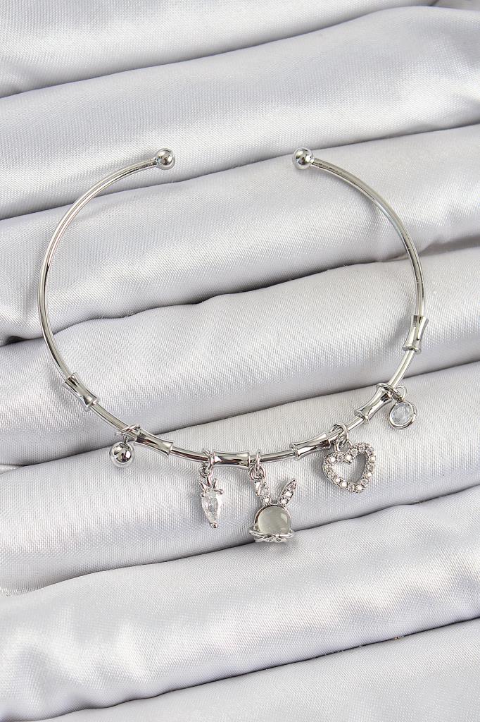 Pirinç Zirkon Taşlı Tavşan Ve Kalp Model Gümüş Renk Charm Bileklik - BB7348