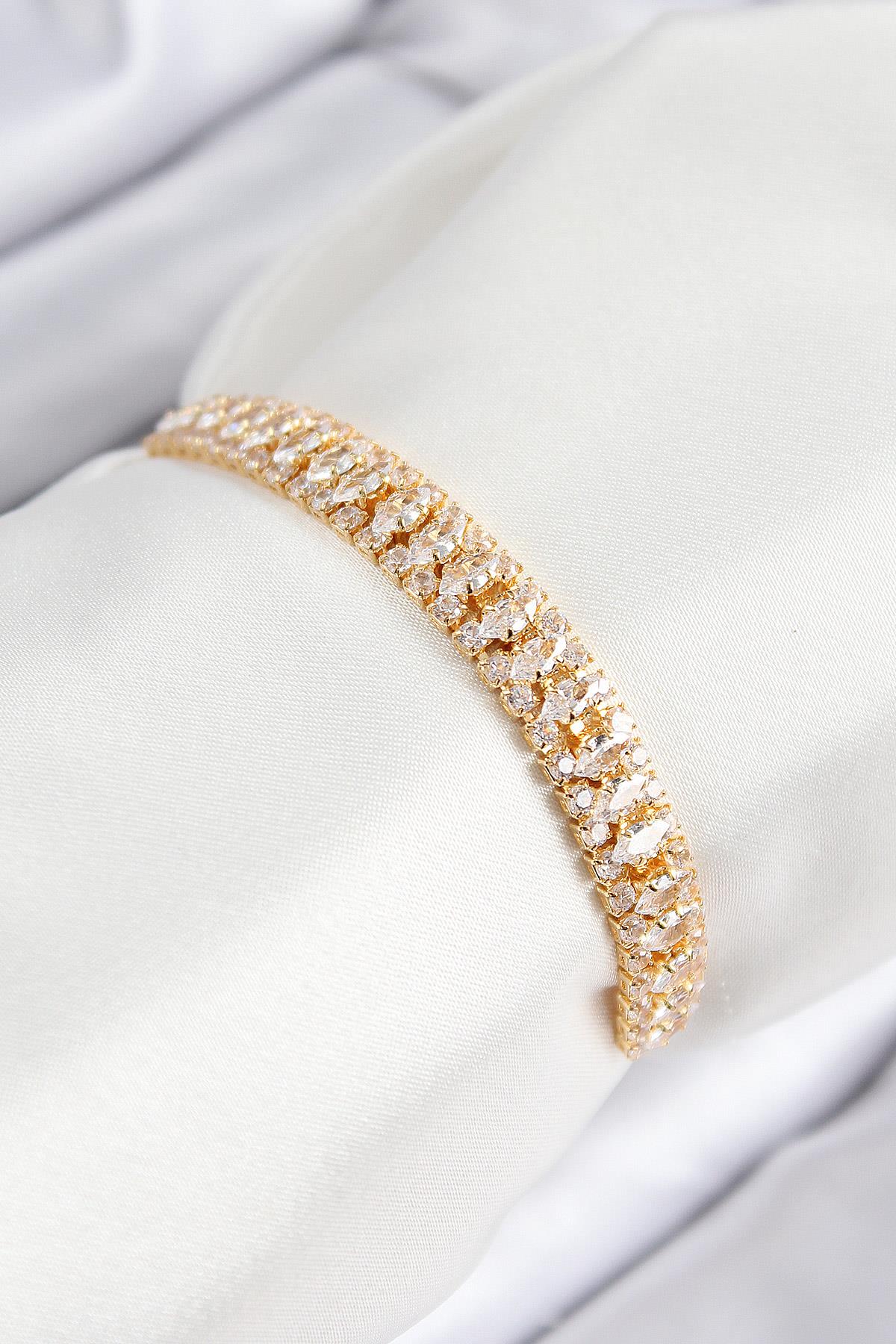 Pirinç Zirkon Taşlı Tennıs Model Gold Renk Asansörlü Kadın Bileklik - BB7717