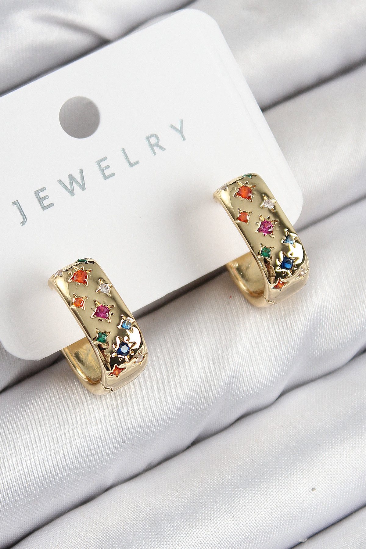 Pirinç Zirkon Taşlı Yıldız Desen Model Gold Renk Kadın Küpe - TJ-BKP11070
