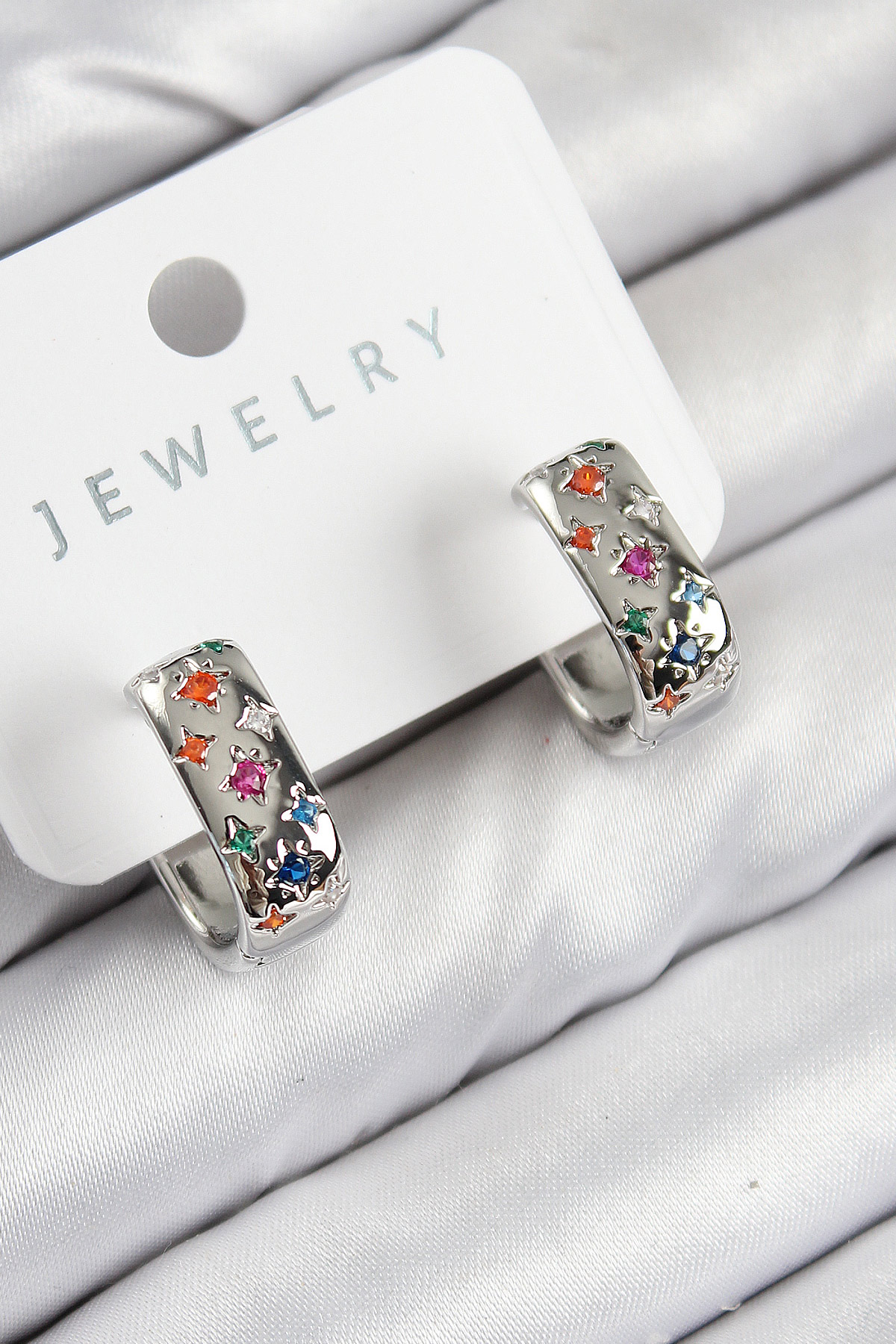 Pirinç Zirkon Taşlı Yıldız Desen Model Gümüş Renk Kadın Küpe - TJ-BKP11069