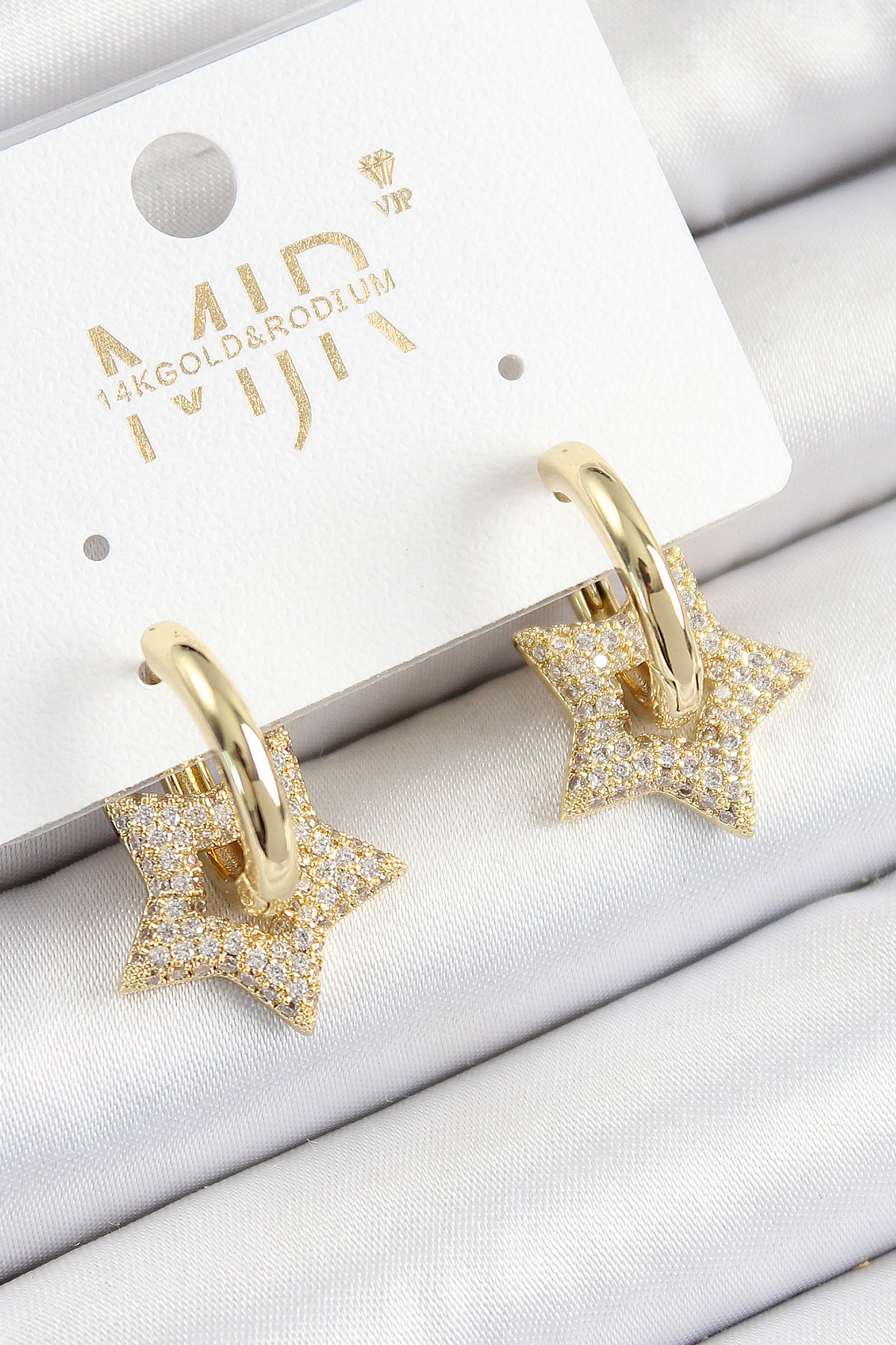 Pirinç Zirkon Taşlı Yıldız Figürlü Halka Model Gold Renk Kadın Küpe - TJ-BKP10783