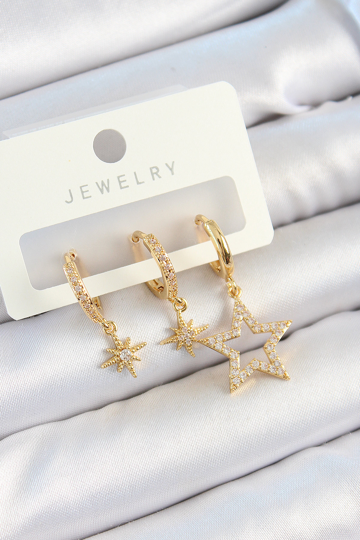 Pirinç Zirkon Taşlı Yıldız Model Gold Renk 3'lü Çift Kadın Küpe Set - TJ-BKP10828