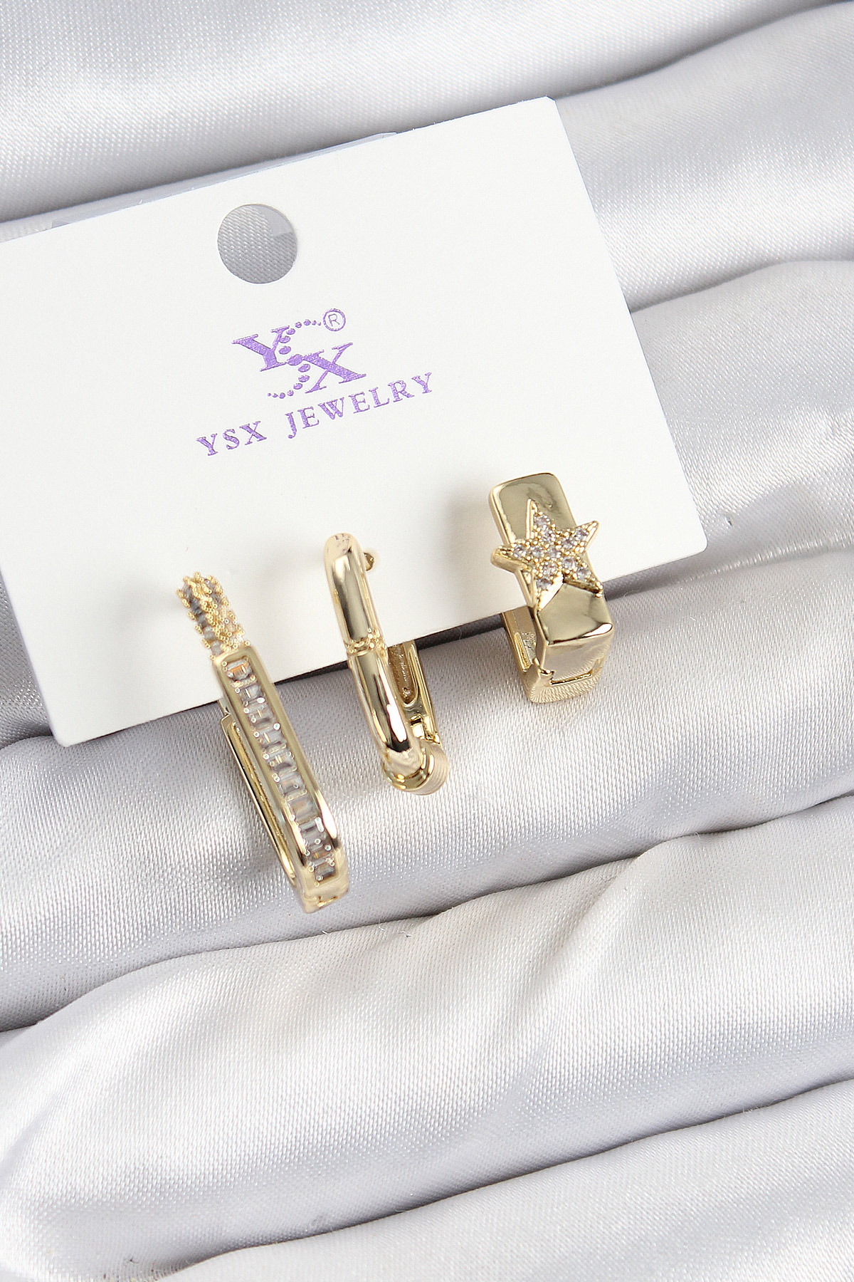 Pirinç Zİrkon Taşlı Yıldız Model Gold Renk 3'lü Kadın Küpe - TJ-BKP10943