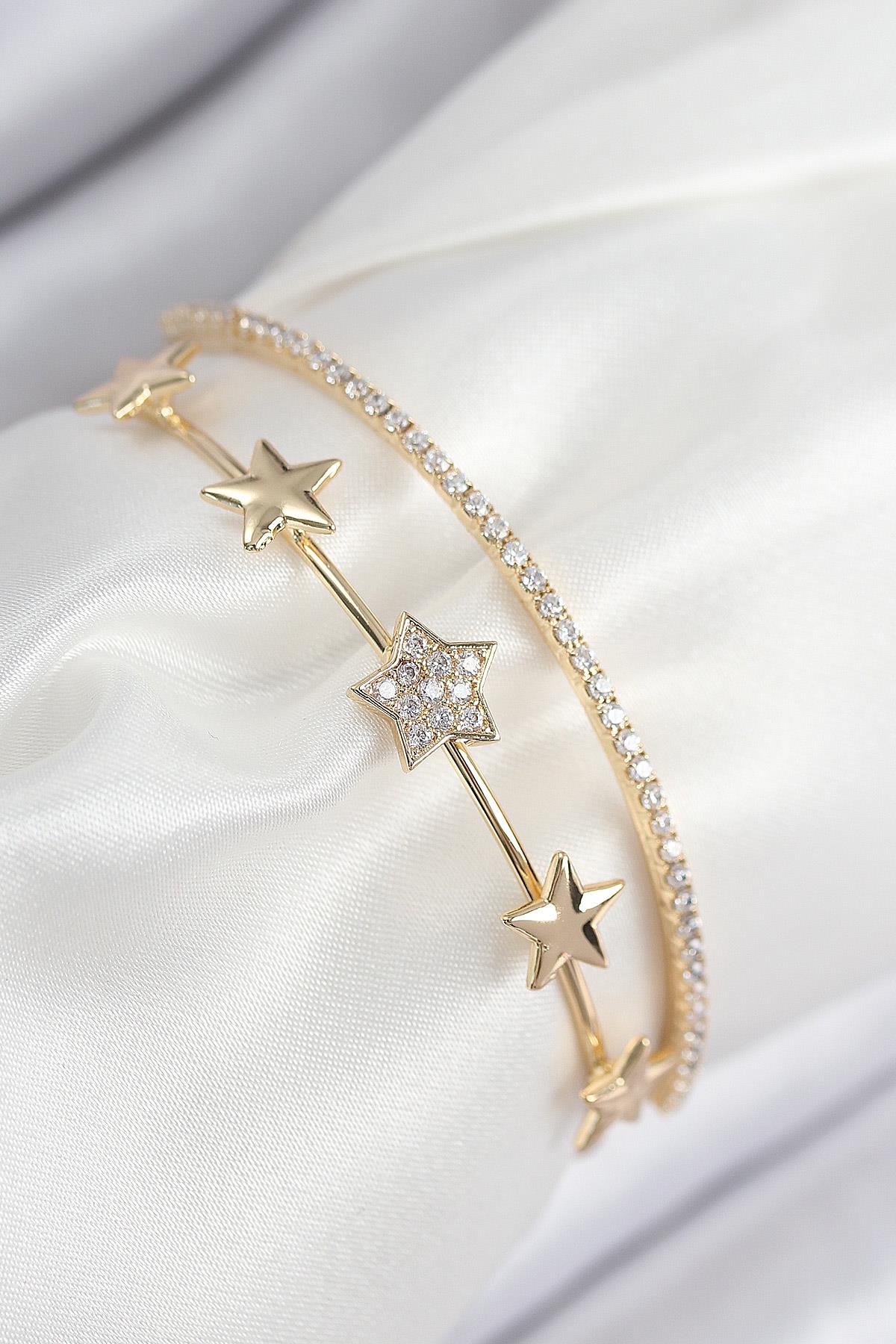 Pirinç Zirkon Taşlı Yıldız Model Gold Renk Kadın Bileklik - TJ-BB7877