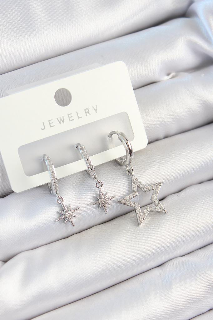 Pirinç Zirkon Taşlı Yıldız Model Gümüş Renk 3'lü Çift Kadın Küpe Set - BKP10790