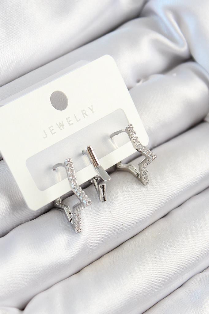 Pirinç Zirkon Taşlı Yıldız Model Gümüş Renk 3'lü Çift Kadın Küpe Set - BKP10798