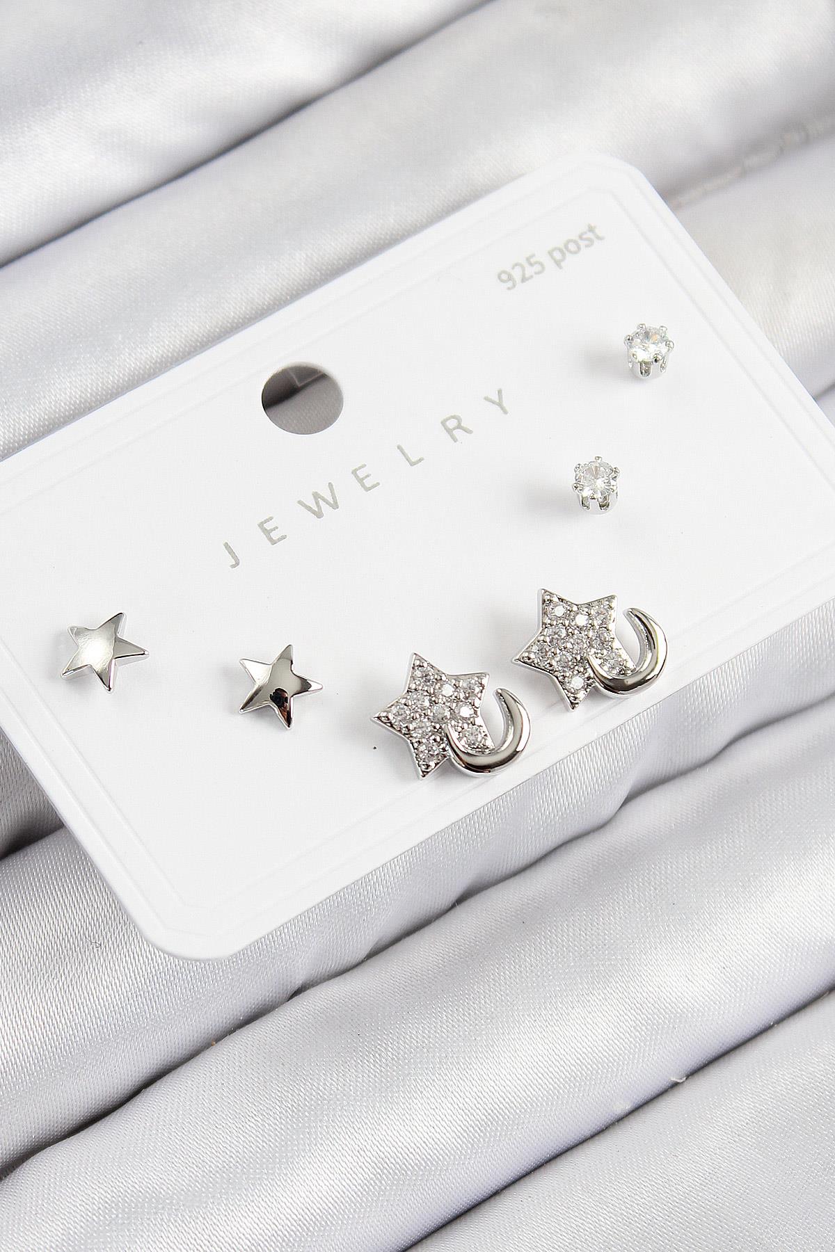 Pirinç Zirkon Taşlı Yıldız Model Gümüş Renk 925 Ayar Gümüş Çivi Kadın Küpe Set - BKP11177