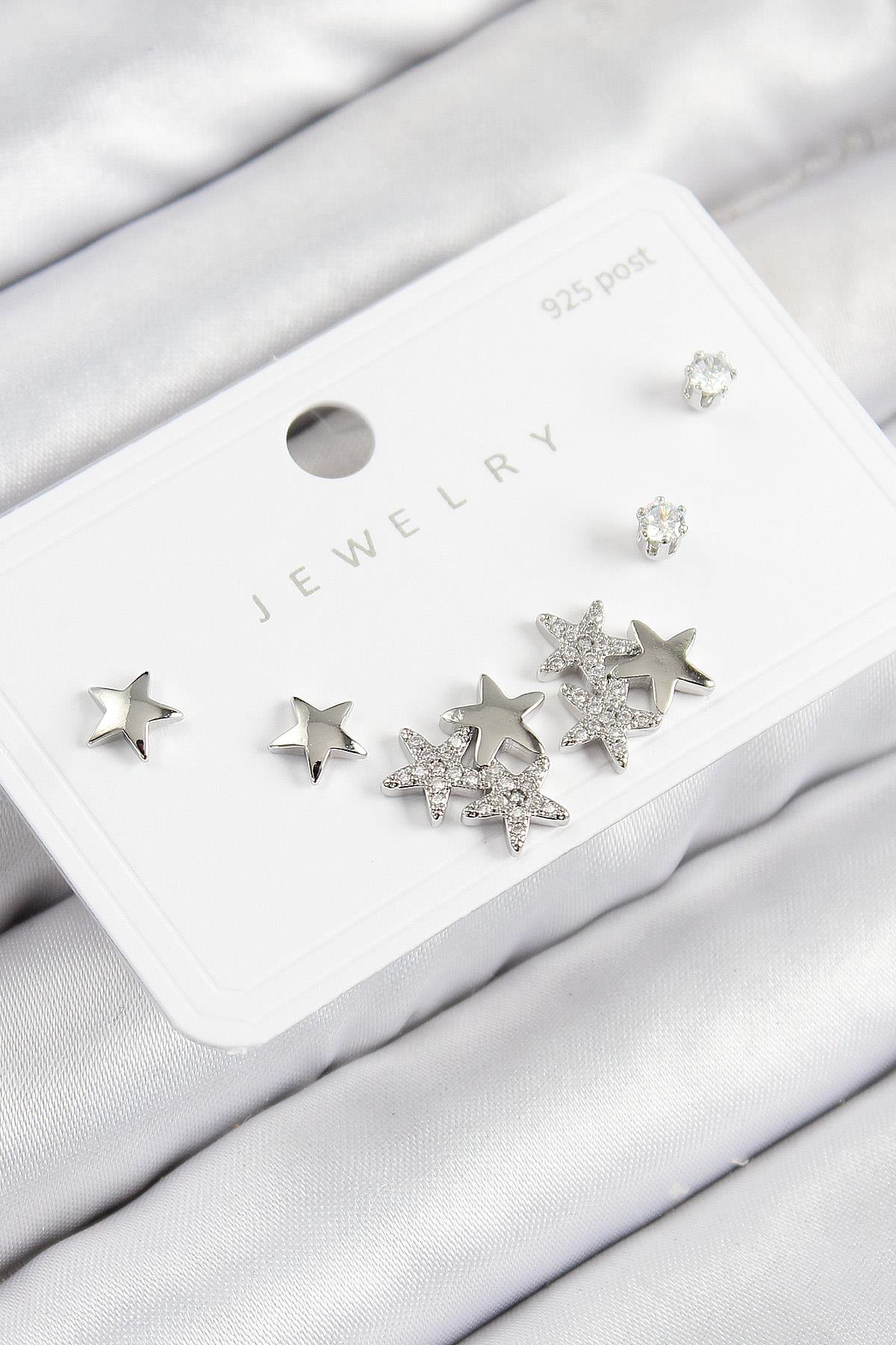 Pirinç Zirkon Taşlı Yıldız Model Gümüş Renk 925 Ayar Gümüş Çivi Kadın Küpe Set - BKP11189