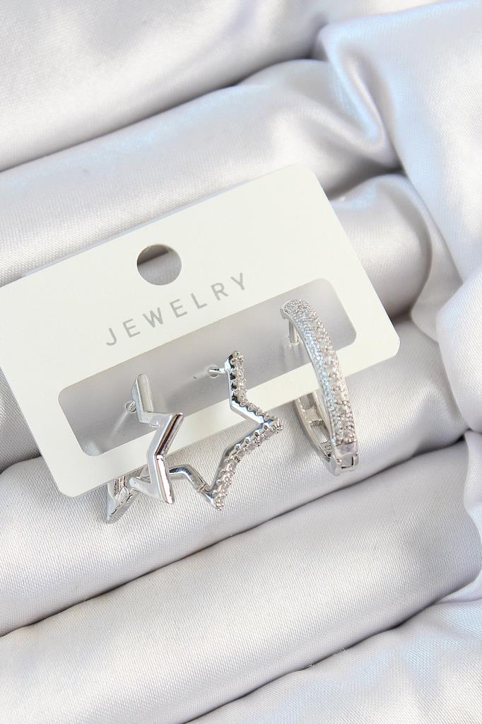 Pirinç Zirkon Taşlı Yıldız Ve Halka Model Gümüş Renk 3'lü Çift Kadın Küpe Set - BKP10808