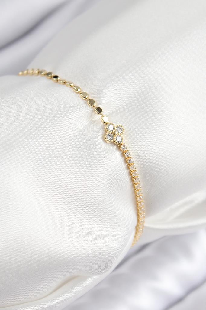 Pirinç Zirkon Taşlı Yonca Model Ezme Zincir Gold Renk Kadın Bileklik - BB7591