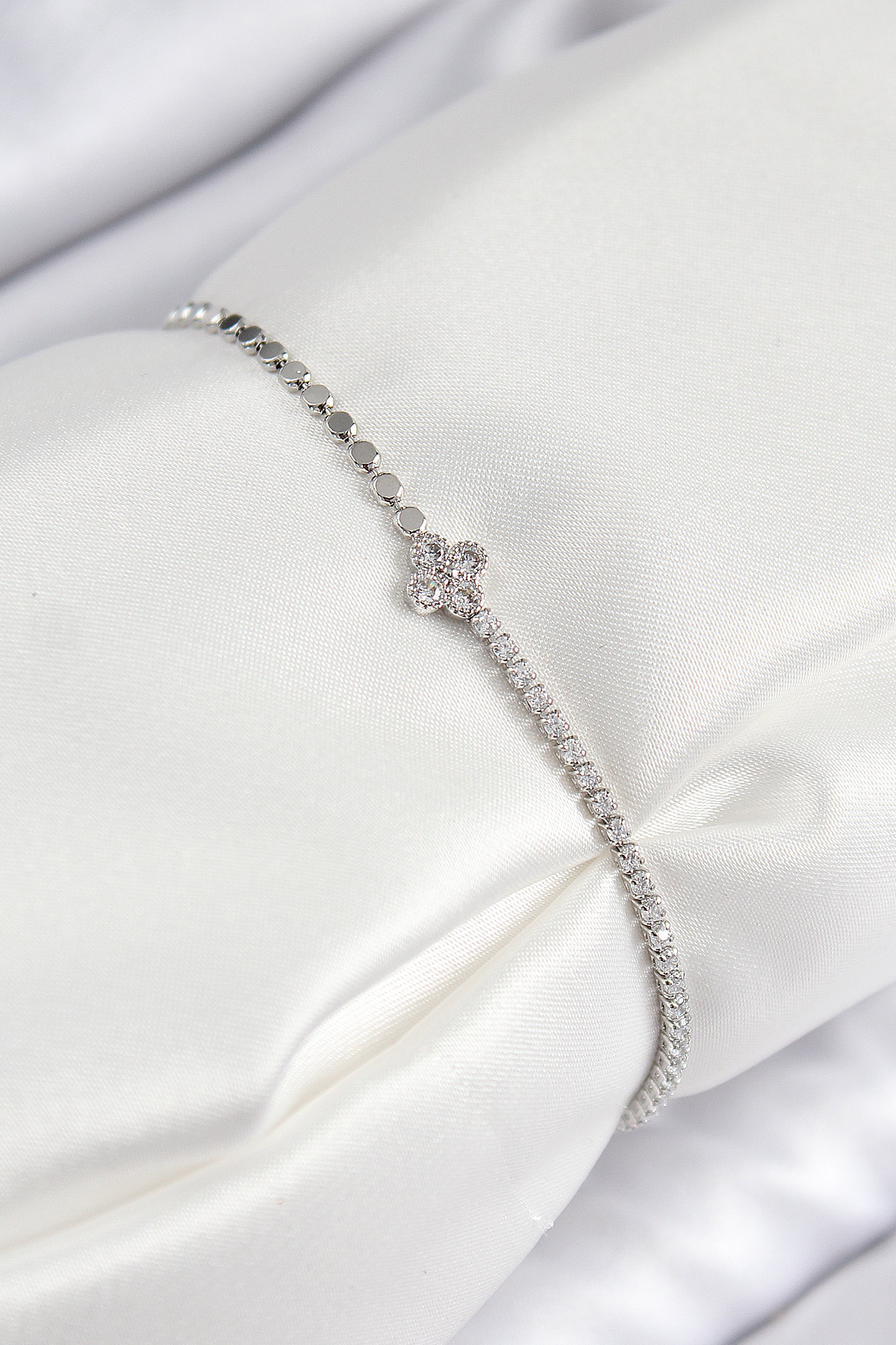 Pirinç Zirkon Taşlı Yonca Model Ezme Zincir Gümüş Renk Kadın Bileklik - TJ-BB7592