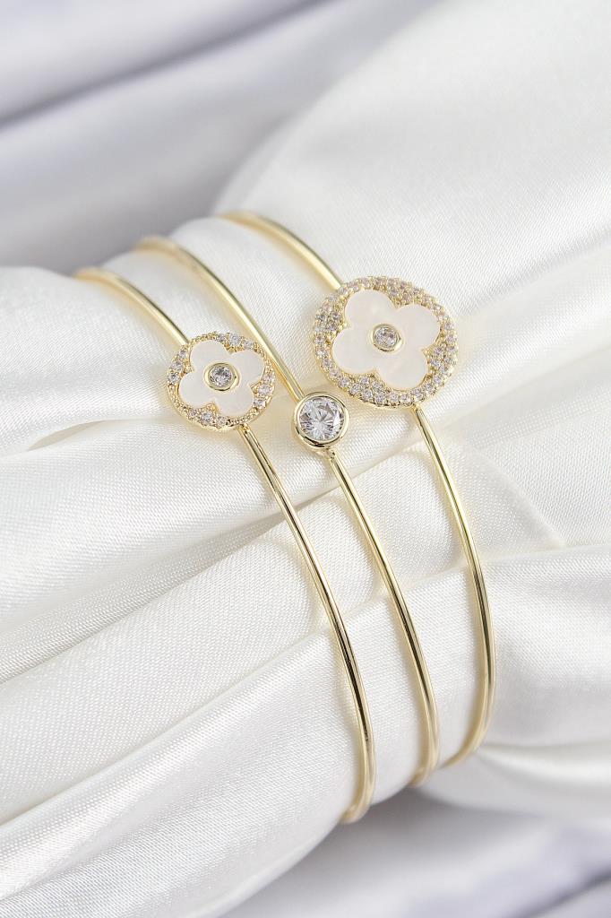Pirinç Zirkon Taşlı Yonca Model Gold Renk Vip 3'lü Kadın Bileklik - BB7336