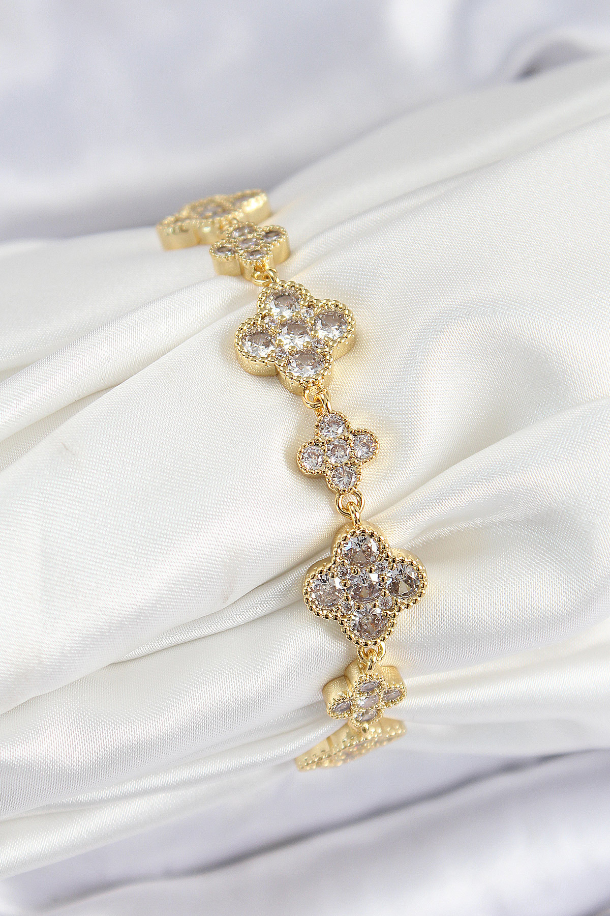 Pirinç Zirkon Taşlı Yonca Model Gold Renk VIP Seri Kadın Bileklik - TJ-BB7520