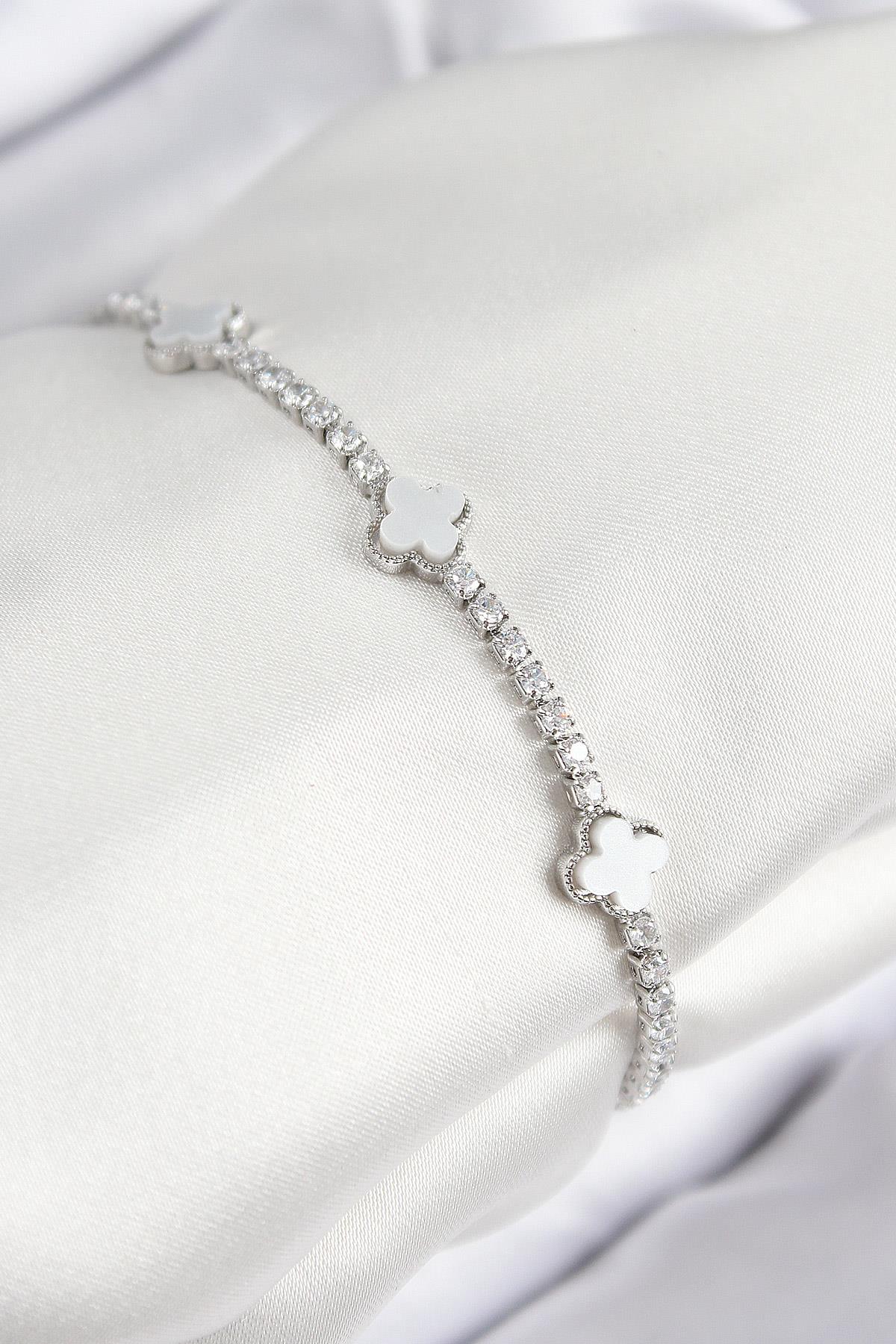 Pirinç Zirkon Taşlı Yonca Model Gümüş Renk Kadın Bileklik - BB7702