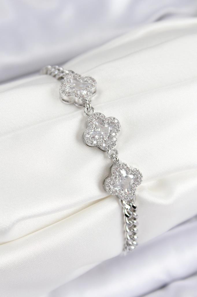 Pirinç Zirkon Taşlı Yonca Model Gümüş Renk Kadın Bileklik - BB7546