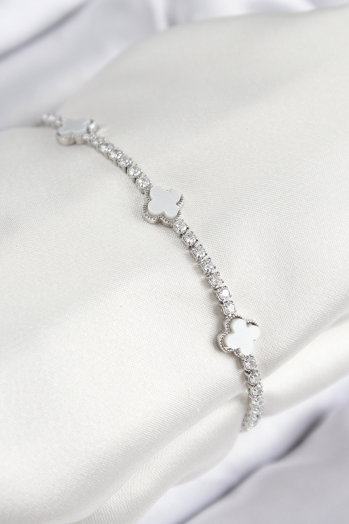Pirinç Zirkon Taşlı Yonca Model Gümüş Renk Kadın Bileklik - TJ-BB7702
