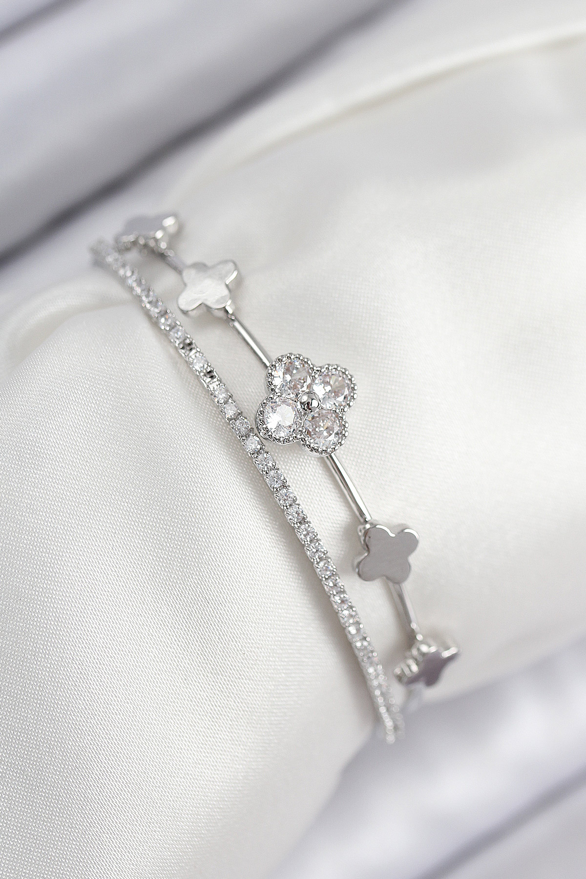 Pirinç Zirkon Taşlı Yonca Model Gümüş Renk Kadın Bileklik - TJ-BB7886