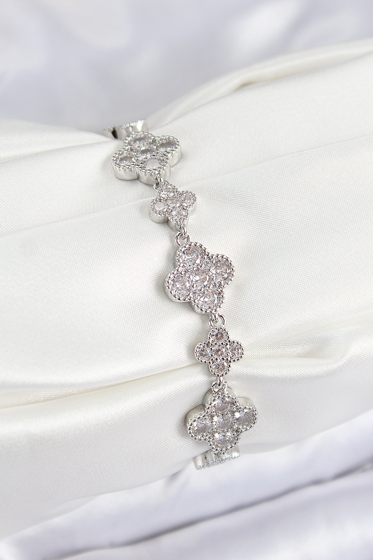 Pirinç Zirkon Taşlı Yonca Model Gümüş Renk VIP Seri Kadın Bileklik - TJ-BB7521