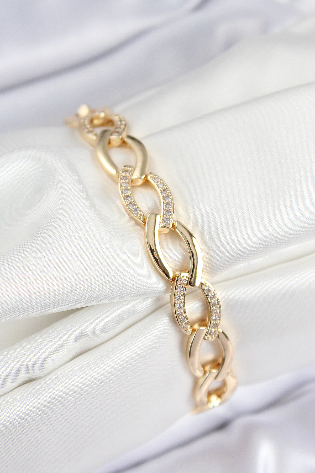 Pirinç Zirkon Taşlı Zincir Model Gold Renk Kadın Bileklik - TJ-BB7553