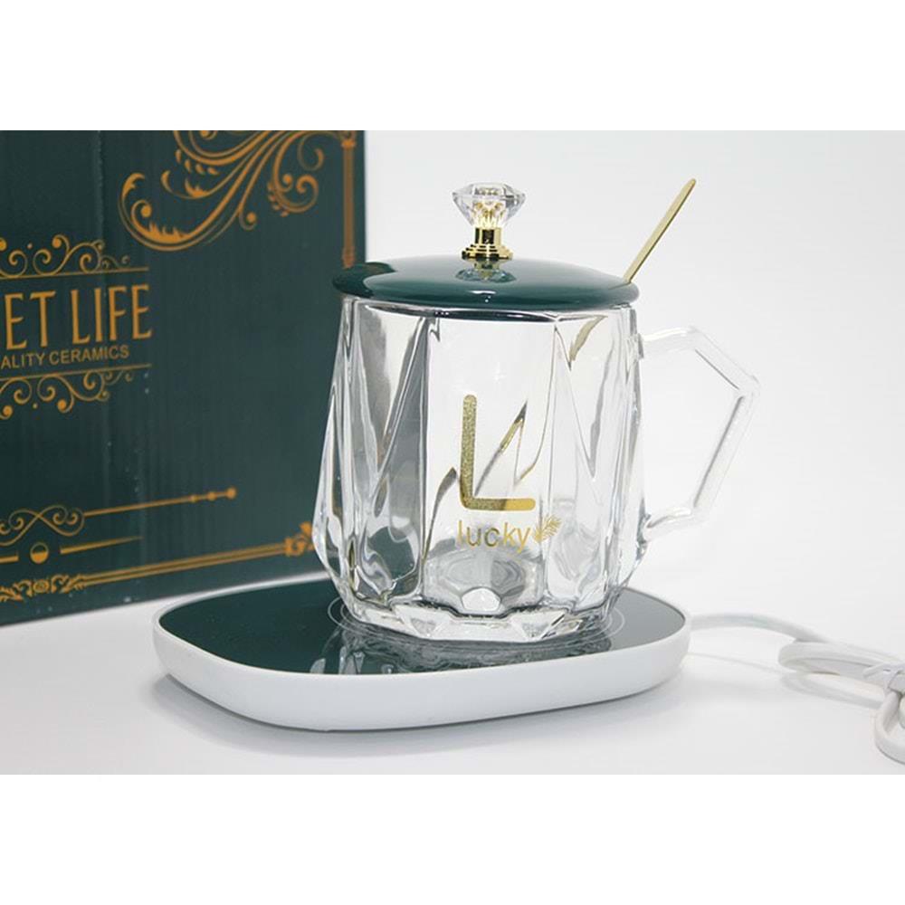 Porselen Kapaklı Isıtıcılı Cam Kupa Bardak Dekoratif Hediyelik