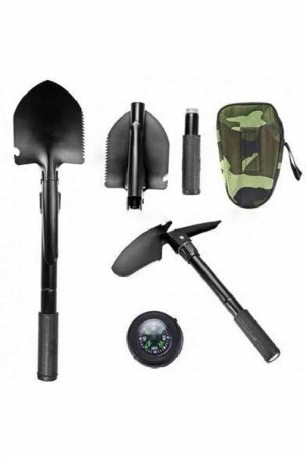 Kamp, doğa yürüyüşü, keşif ve acil durumlar gibi outdoor aktivitelerinde ihtiyacınız olan tüm işlevleri tek bir kompakt yapıda buluşturan bu portatif çantalı pusulalı katlanabilir kazma kürek seti, çok yönlü tasarımıyla öne çıkıyor. Katlanabilir yapısı sayesinde kolayca taşınabilir ve çantasında güvenle muhafaza edilebilir. Her yönüyle pratik ve dayanıklı olan bu set, zorlu koşullarda bile en büyük yardımcınız olmaya hazır.Ürün; kazma, kürek, testere, balta, şişe açacağı ve yön tayini için pusula gibi birçok işleve sahiptir. Sertleştirilmiş karbon çelikten üretilmiş olması, uzun ömürlü ve sağlam kullanım sağlarken, ergonomik kauçuk kaplama tutma sapı da konforlu bir kullanım sunar. 41,5 cm’ye kadar açılabilen boyutuyla taşıma kolaylığı ve işlevsellik arasında ideal dengeyi kurar.Çok amaçlı tasarımıyla kamp alanında yer açmaktan, odun toplamaya; kar küremekten yön bulmaya kadar birçok görevi üstlenebilir. Kompakt yapısı sayesinde sırt çantasında kolaylıkla taşınabilir. Zorlu doğa koşullarında yalnızca bir alet değil, aynı zamanda güven veren bir ekipman olarak yanınızda bulunması gereken bu set, doğada geçirdiğiniz her anı daha güvenli ve konforlu hale getirir.