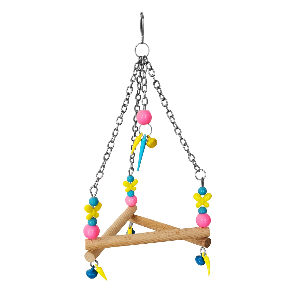 Üçgen zilli kuş salıncağıdır. Salıncağın alt kısmında üç adet tünek mevcuttur. Renkli kelebek aksesuarları sayesinde dikkat çekici ve şık bir görünüme sahiptir. Boncuklu ve çanlı kuş salıncağı sayesinde kanatlı dostunuz çok eğlenecektir. Zincirli tünekli salıncak, kuş oyuncağı olup renkli boncuklarla özel olarak üretilmiştir. Asılan kısımdan aşağıya doğru sallanan boncuklu ve çanlı aksesuarı mevcuttur. Bu tür oyuncaklar zihinsel egzersiz oluşturması açısından yararli olup fiziksel egzersize teşvik eder. Farklı oyuncaklar kullanmak kuşun ilgisinin çeker, bu sebeple dönem dönem oyuncak değişikliği yapılması kanatlı dostunuzun sıkılmasını ve bunalıma girmesini önleyecektir.