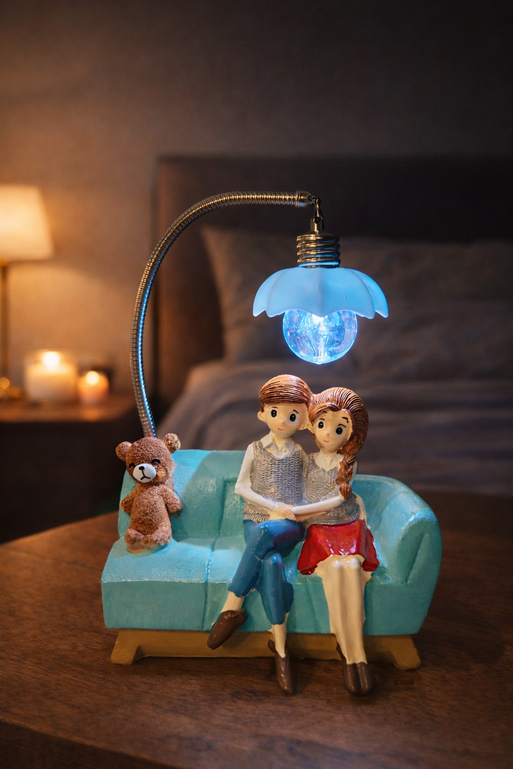 Sevimli çift figürü, kanepe detayları ve ayarlanabilir lambasıyla “birlikte geçirilen huzurlu akşamları” simgeler. Akşam saatlerinde loş bir ortam oluşturarak dinlendirici ve romantik bir ambiyans sağlar. Polyester malzemeden yapılmıştır, el boyamasıdır.