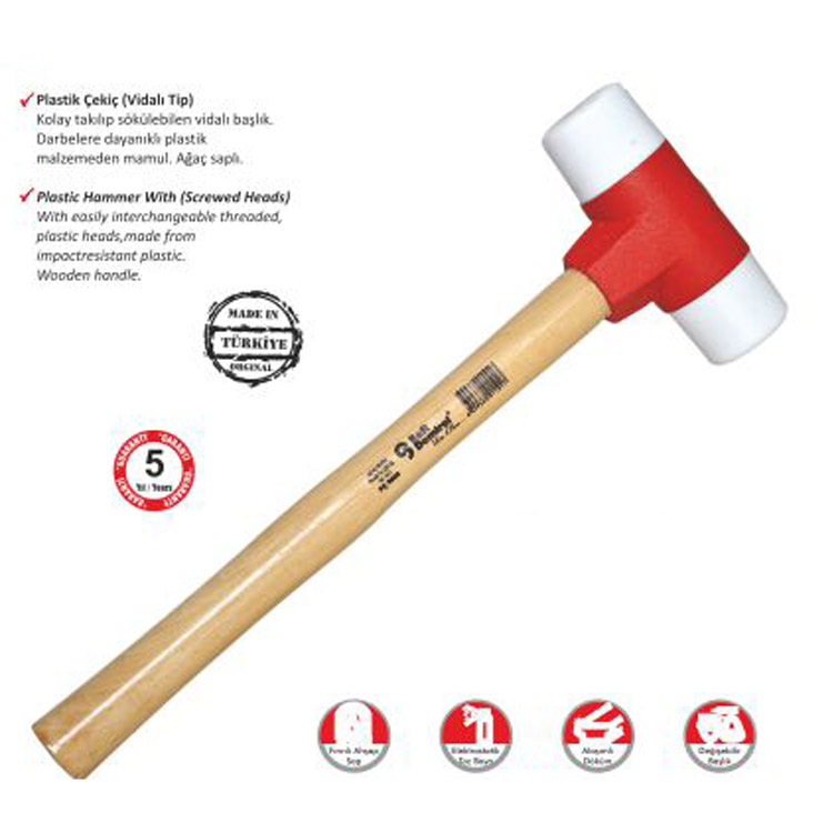 - Malzeme: Çekicin baş kısmı, darbelere dayanıklı ve yüzeylere zarar vermeyen yüksek kaliteli sert plastikten üretilmiştir. Sap kısmı ise doğal ahşap malzemeden yapılmış olup, ergonomik tasarımı sayesinde rahat bir tutuş sağlar.