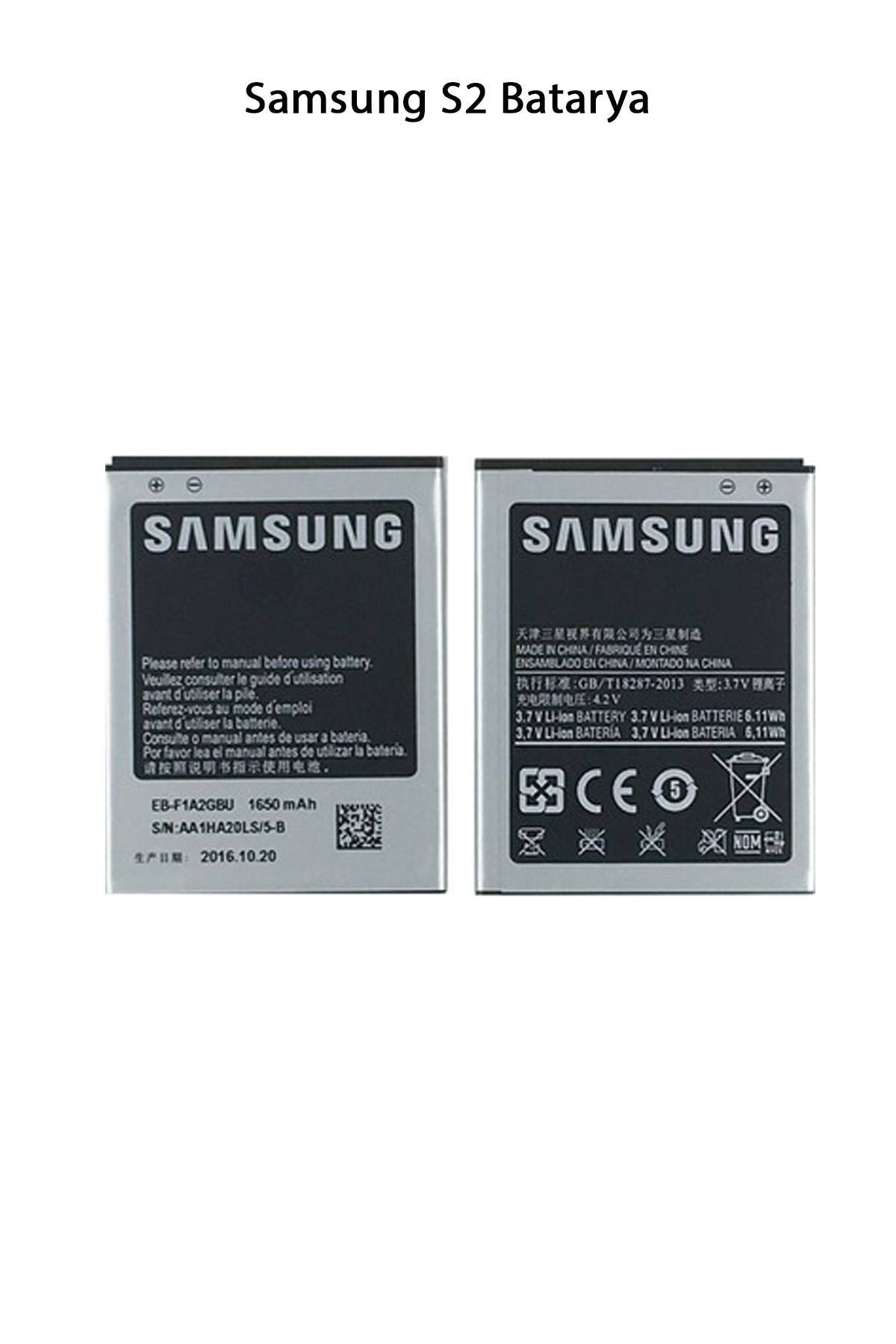 | Samsung Galaxy S2, 1650 mAh kapasiteli bir bataryaya sahiptir. Bu batarya, tam şarjla birlikte normal kullanımda yaklaşık 1 gün süreyle dayanabilir. Paket İçeriği : 1 Adet Samsung S2 Batarya |
