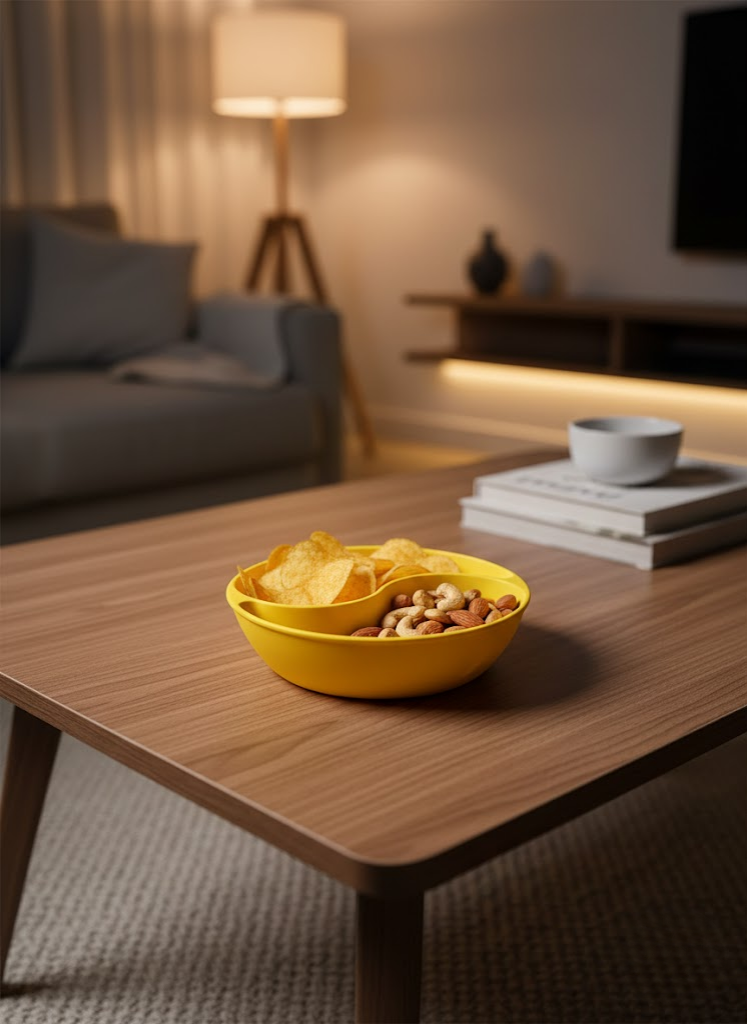 Bölmeli yapısı, farklı çerez türlerini aynı anda sunma imkânı sağlar. Çerezler birbirine karışmadan düzenli bir sunum elde edilir. Sarı rengi, masa üzerinde enerjik ve sıcak bir görünüm oluşturur. Özellikle salon masası, sehpa veya TV ünitesi üzerinde kullanıldığında dekoratif bir detay olarak da öne çıkar.