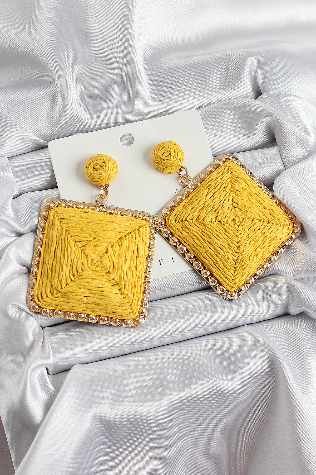Sarı Kare Figürlü Hasır Örgü Model Gold Renk Kadın Küpe - TJ-BKP10716