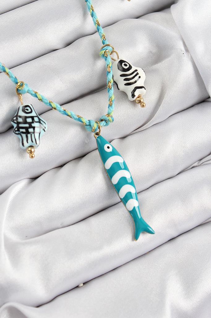 Seramik Motifli Balık Figürlü Model Mavi İp Kadın Kolye - BKO10396