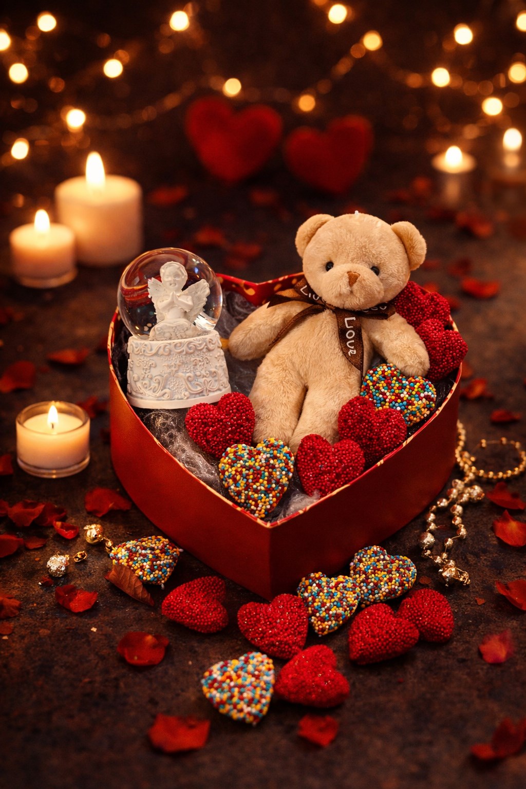 Kalp şeklindeki dekoratif kutu içerisinde yer alan sevimli ayıcık, melek figürlü kar küresi ve kalp detaylı süslemeler, hediyenizi unutulmaz kılar. Açıldığı anda mutlu eden, “aç & ver” konseptinde pratik ve şık bir seçimdir.