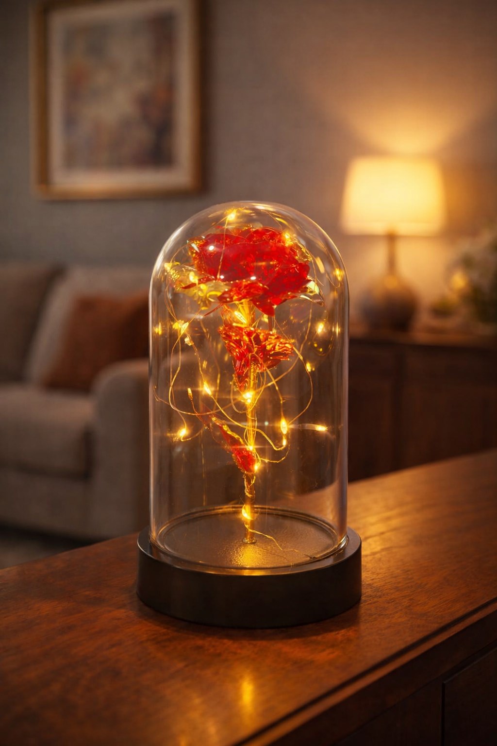 • Mika fanus içinde estetik gül tasarımı Sıcak sarı LED ışıklarla romantik ambiyans