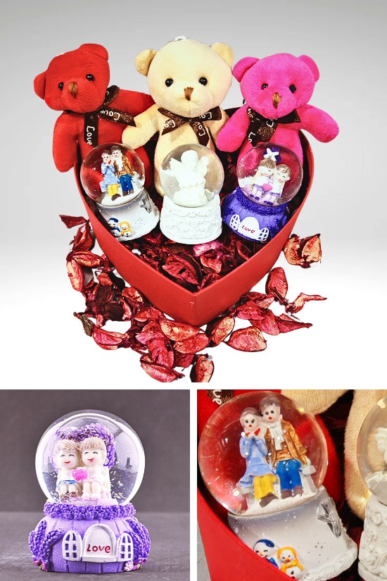 Sevgiliye Kalp Kutuda 3 Mini Ayıcık ve 3 Mini Kar Küresi Hediye Kutusu