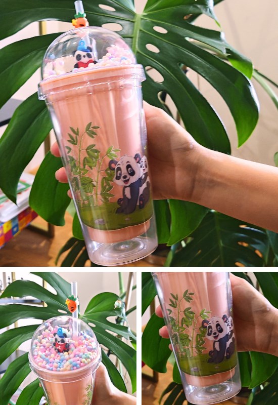 Sevimli Panda Temalı Çift Katman 450 ml Suluk Pipetli Mika Matara Pembe 2770